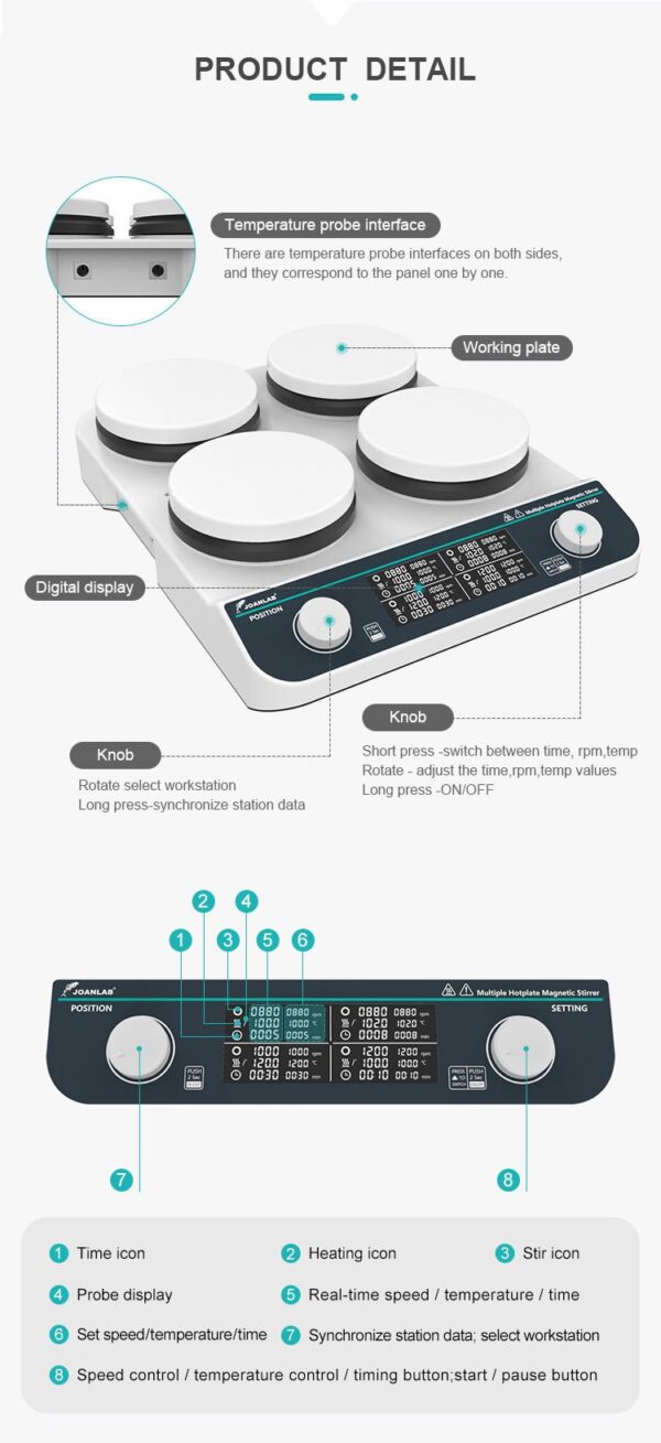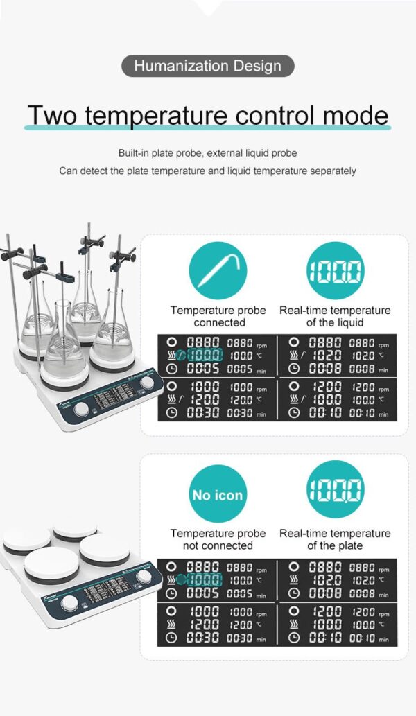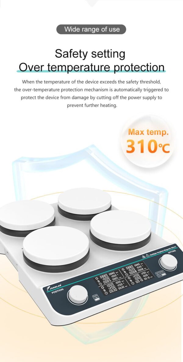 | JOANLAB HHMS-4Max 4 Gözlü Isıtıcılı Manyetik Karıştırıcı 50… 1500 rpm / 4 x 500 mL / RT… 3100 °C, çeşitli deneysel ihtiyaçları karşılamak için dört bölmedeki numuneler bağımsız olarak karıştırılıp ısıtılabilir. Termokupl ile sıcaklık kontrolü sağlanabilir. 1. LCD ekran 2. Fırçasız DC motor 3. Zamanlama ve durdurma fonksiyonu 4. Seramik kaplı paslanmaz çelik yüzey 5. Her bölme 500 mL bağımsız ısıtma ve karıştırma kapasitesine sahip |