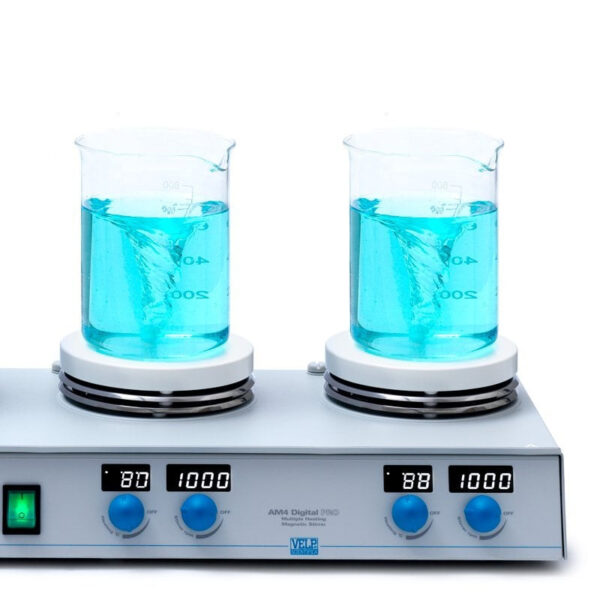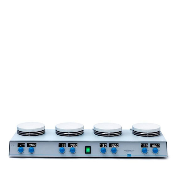 Öncelikle, VELP AM4 Dijital PRO Çoklu Isıtıcılı Manyetik Karıştırıcı dört bağımsız pozisyona sahip dijital kontrolüyle laboratuvarlarda hassas karıştırma ve ısıtma işlemleri için tasarlanmıştır. Özellikle, her biri 135 mm çapında seramik kaplamalı alüminyum alaşımlı tablalar, 370°C’ye kadar ısıtma ve 20 litreye kadar karıştırma kapasitesi sunar. Dahası, 50-1500 rpm hız aralığı ve ±0.5°C (VTF ile) ısı kontrol hassasiyeti sağlar.